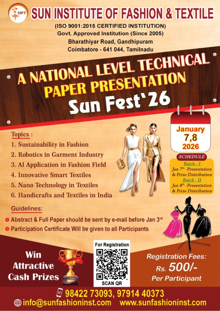 Sun Fest ’26 is a National Level Technical Paper Presentation designed for students who are passionate about fashion, textiles, technology, and innovation. This platform encourages young minds to present innovative ideas, research concepts, and emerging technologies shaping the future of the fashion and textile industry.