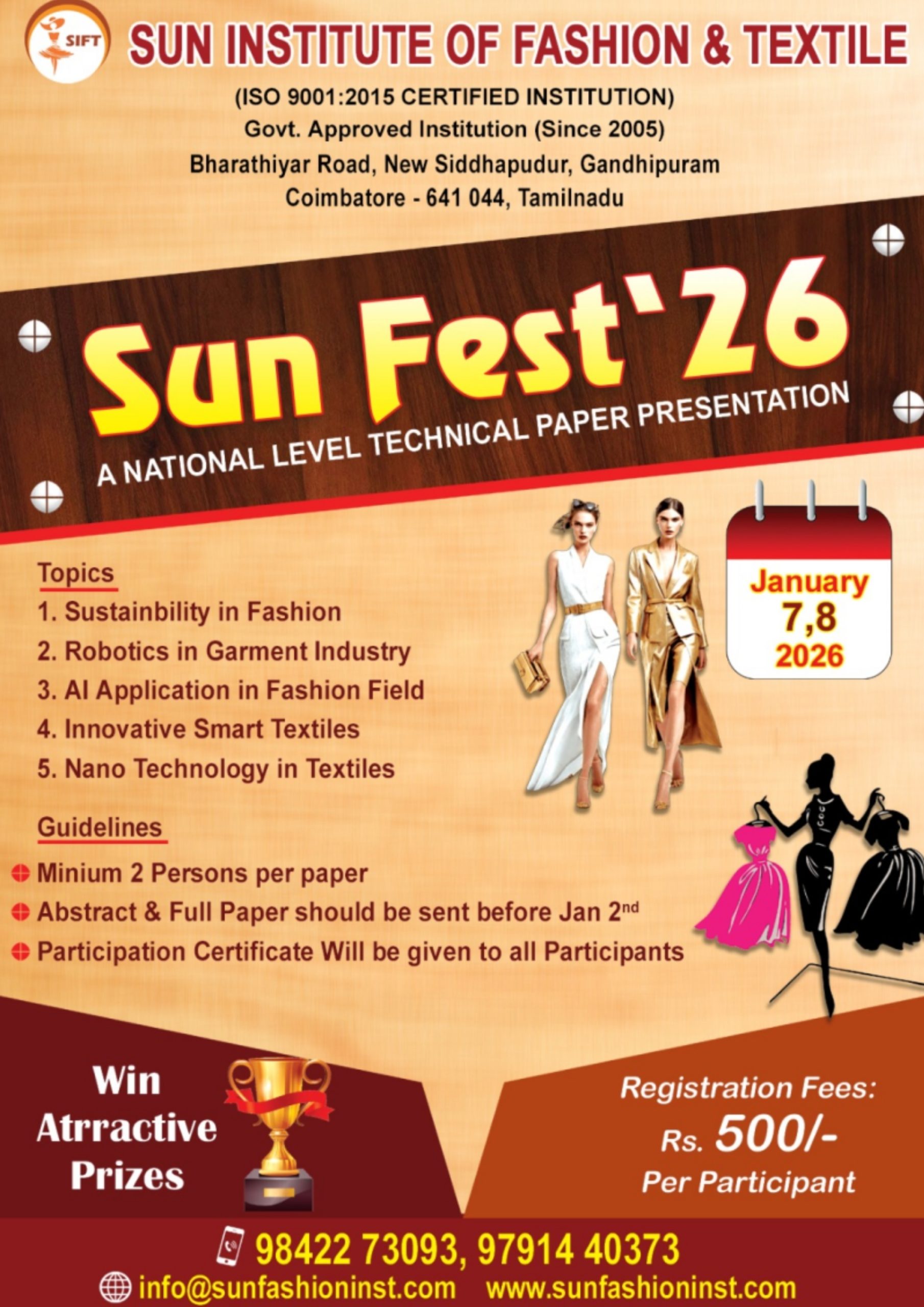Sun Institute of Fashion & Textile (SIFT) proudly announces Sun Fest ’26, a National Level Technical Paper Presentation focusing on the future of fashion, textiles, and emerging technologies.